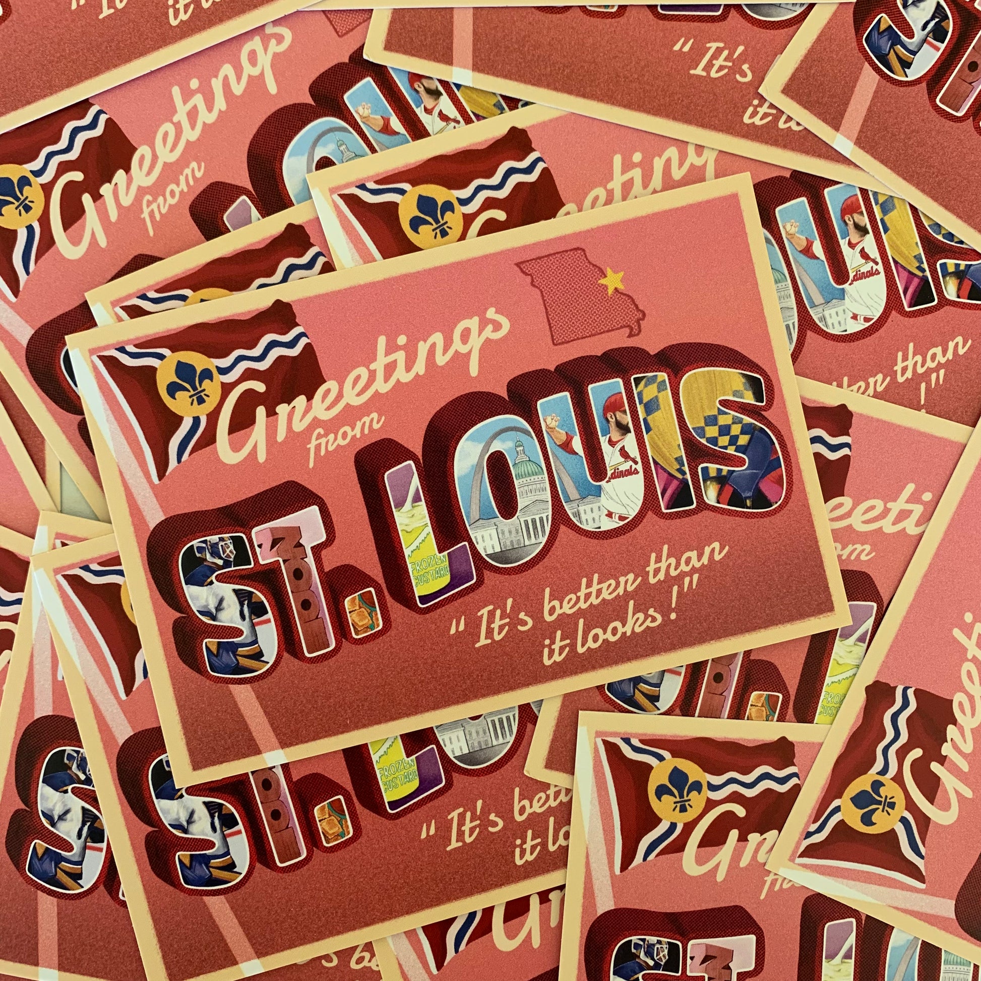 Enhance your welcome bags with our STL Postcard! This postcard proudly showcases the iconic St. Louis flag, with bold 'St. Louis' lettering filled with famous STL imagery and locations. Created by the talented @jilliankayeart, this postcard is a perfect little gift. Personalize the back with a custom note – whether it's a heartfelt handwritten message or a simple label. Order now and share the STL love!