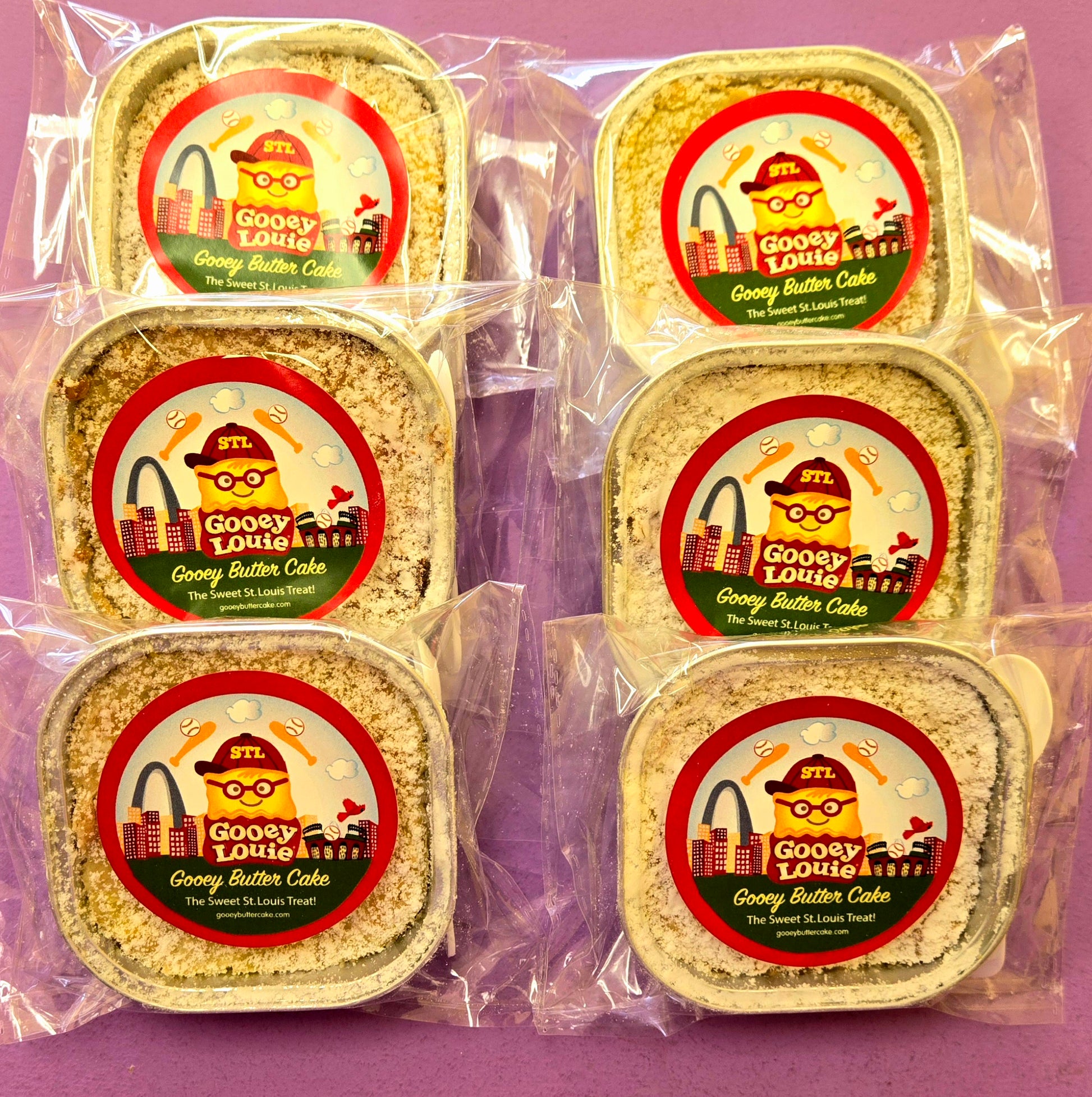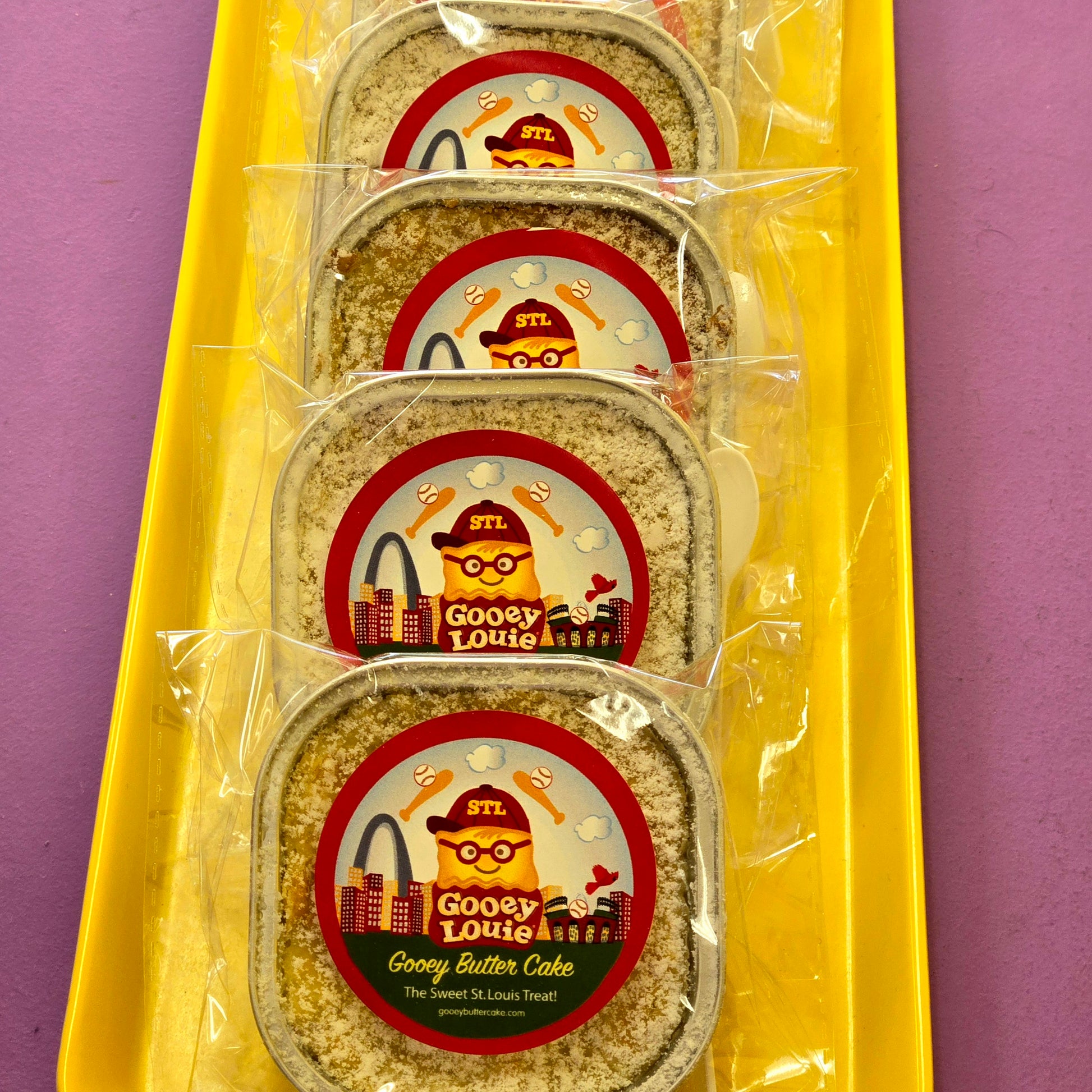 Baseball lovers with a sweet tooth, this one's for you! Enjoy our original mini gooey butter cake. Our "Baby" Louies are baked from scratch in their own tins, wrapped in cello bags, and packaged with a mini spoon for easy enjoyment. The packaging features the St. Louis skyline and charming baseball motifs. These cakes are a great treat for weddings, events, or whenever you crave a little taste of gooey goodness. Order now!